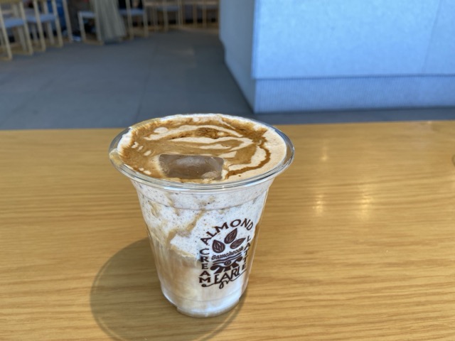 주문한 아몬드크림라떼는 고소한 아몬드크림이 한가득 올라가 있고, 그 위로 에스프레소가 또렷하게 내려진 라떼였다.