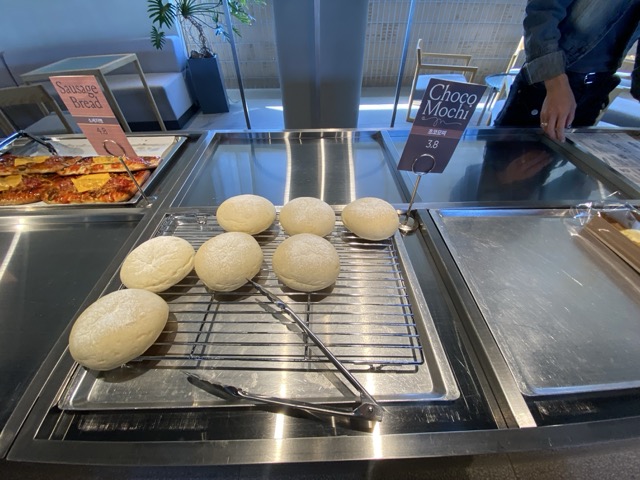 빵 종류도 몇 가지 보였는데 시간이 좀 이른 편이라 다 진열되지는 않은 듯했다. 그래도 종류가 꽤 있어 보였고, 케이크보다는 빵 위주의 구성 같았다.